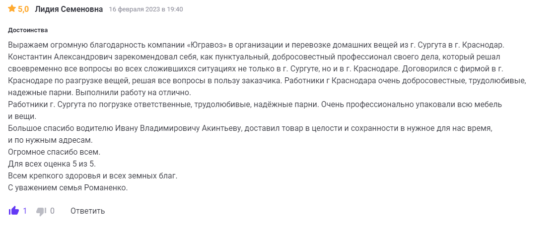 В конце концов, Виктория задумалась о том, как было бы проще и комфортнее обратиться в надежную компанию Югравоз. Эта компания известна своей профессиональной работой и хорошим обслуживанием. Если бы Виктория выбрала Югравоз, она избежала бы множества проблем и головной боли. Таким образом, эта ситуация стала для нее настоящим уроком: стоит выбирать проверенные и надежные компании для таких важных задач, как переезд.